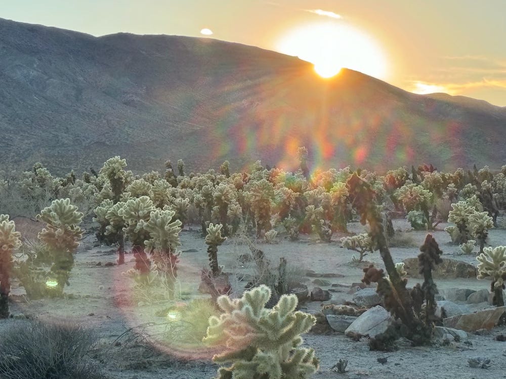 Yet, of all the flora in this vast wonderland, my favorite area was the Cholla Cactus Garden. The cholla, pronounced choy-ya, is a cactus known for its barbed spines that attach themselves to anything that touches it. There are several species of cholla, but the ones we saw were referred to as “teddy bear cactus” because they look so sweet, soft, fuzzy, and fluffy. But don’t be fooled; they are covered with formidable spines. We arrived for a dazzling sunset illuminating the cholla in a sensational spectacle.