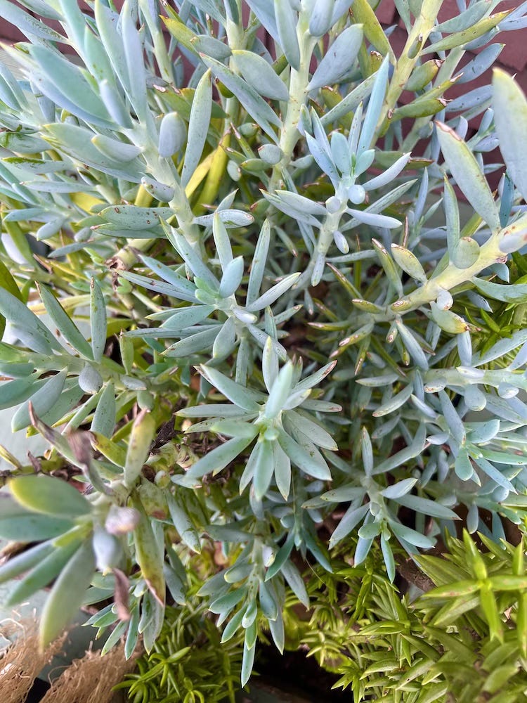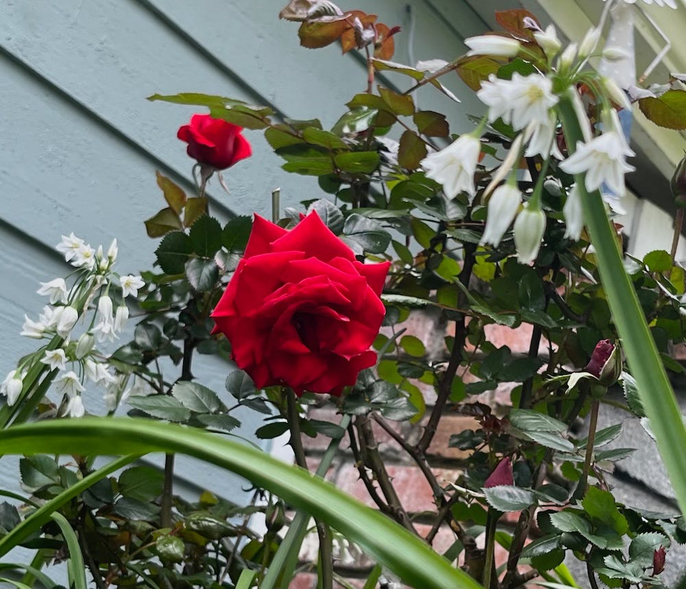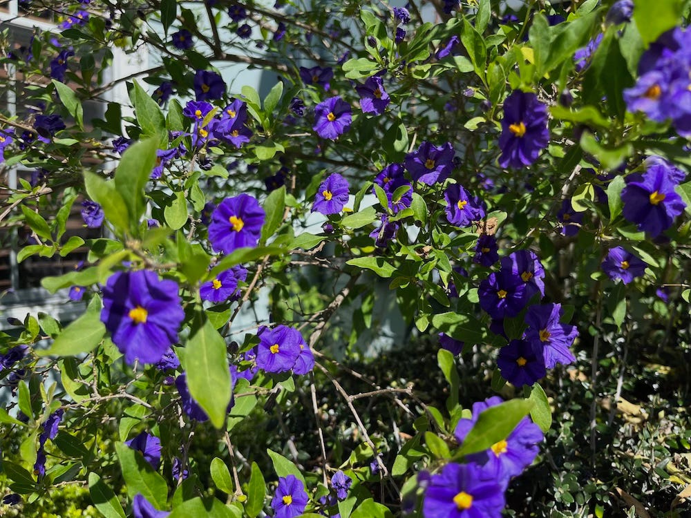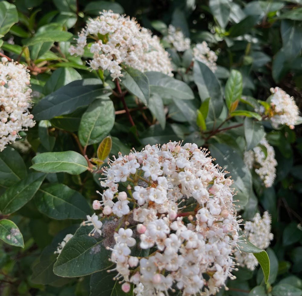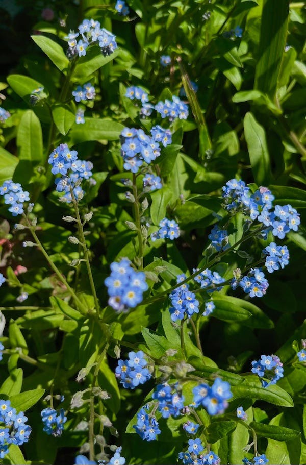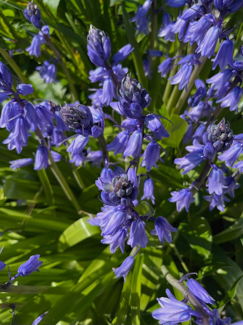 My roses, which I heavily pruned in February, are also blooming. Not to be overlooked, forget-me-nots blanket shaded areas while woodland hyacinths, also known as English bluebells and sea foam statice have naturalized in sunny locations dressed to impress the garden in shades of blue and purple. Supporting the butterfly and bird population, the white clusters of viburnum flowers provide nectar for the flitting butterflies while the forming black berries feed the birds. California poppies, calendula, tulips, daffodils, potato vine, anemones, Dutch iris, bearded iris, Calla lilies, periwinkle, a variety of succulents, and masses of weeds carpet my meadow hillside and orchard. I’ll be busy for months to come!