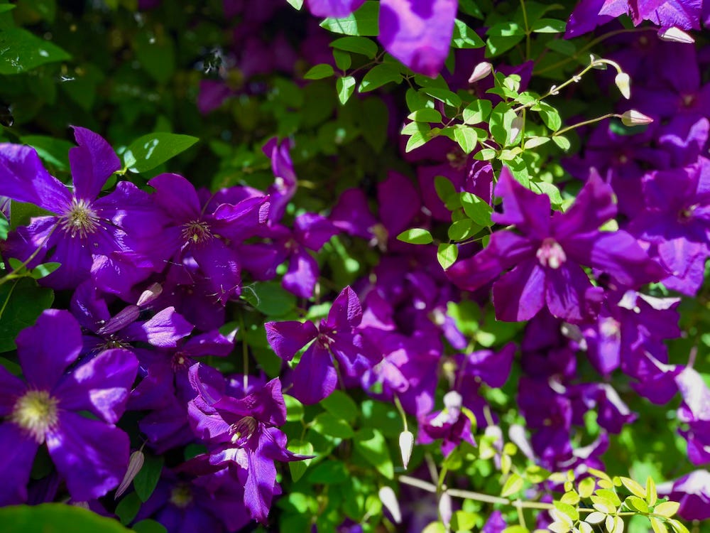 Because of our mild winters and hot summers, we can expect a wide range of blooms this summer. Stunning clematis experiences its second seasonal display, climbing and covering a pipe. Like most plants, clematis prefers well-drained soil filled with rich organic matter. Once clematis is established, it is relatively low maintenance, requiring minimal water, occasional fertilizer, and pruning to promote healthy growth and abundant flowering, attracting bees, butterflies, and hummingbirds.