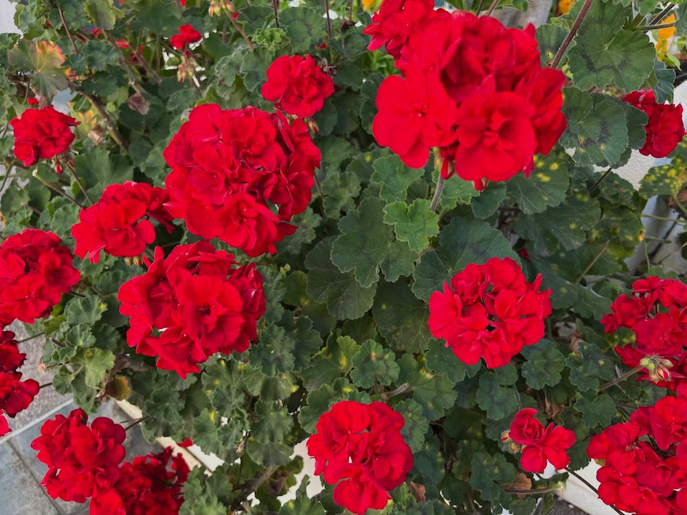 To bring vibrant color to your patio or porch, plant a container of bright red geraniums. Geraniums will grow in full sun or partial shade, easily root from cuttings, and require very minimal care. Prune back spent flowers or leggy stems to encourage bushier blooms that will continue through the fall. Geraniums are the no-fail June boon.