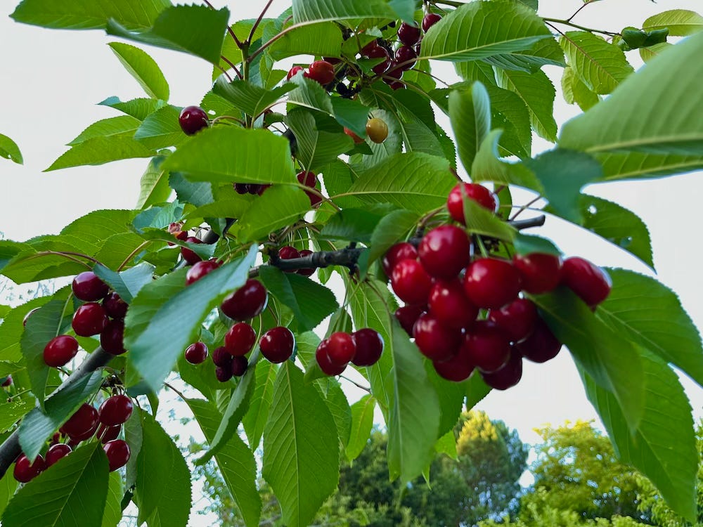 Because of a miniscule harvest last summer, I cut back my trees by a third. This June, my efforts were rewarded with a bounty of sweet cherries, even enough to share with the flying acrobats. Most people are familiar with Bing cherries sold in supermarkets. The deep red-purple black colored Bings are firm, juicy, and known for their rich sweet taste with a hint of tartness. Compared to the Bings, the mild, honeyed flavored, and lesser-known Queen Anne varieties are crunchier, marbled with bright red and yellow hues. Like the birds, I gobble them fresh from the branch. When I was a kid, our family always worked on neighboring farms picking cherries, which usually ripened in late May. The pay was minimal, but the perks included opportunities to eat these delectable fruits as we filled the buckets for sale. One year my siblings and I competed for who could pick the most cherries in the fashion of “one in my mouth, one in the bucket.” Becoming painfully sick, we all paid the price of our childishness. For years, none of us could tolerate the sight of a single cherry.