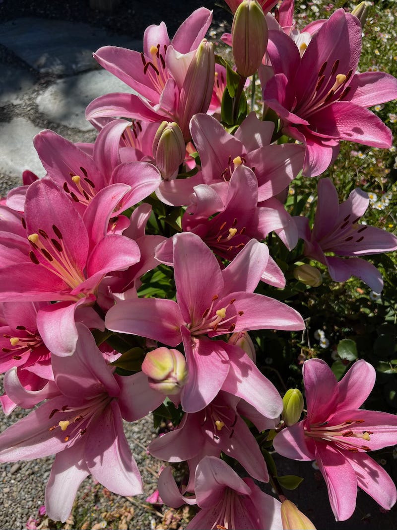 Roses bloom profusely in my garden adding beauty and perfume, while the common corn-flags add spires of fuchsia pink torches. My perennial, spicy-scented Asiatic lilies attract pollinators with captivating fragrances amidst big, bold blooms. Although these lilies make gorgeous bouquets, as the splendid stars of my garden, I am loathe to cut any!