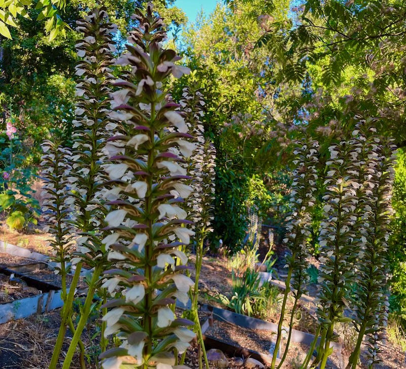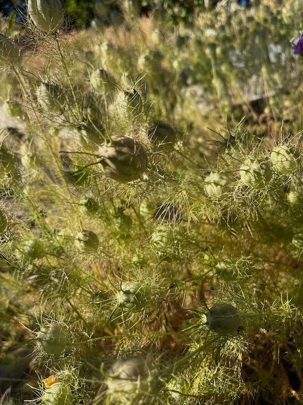 Not many blooms can withstand this heat. Fortunately, my trusty and drought-friendly natives, roses, clematis, agapanthus, pink bower vine, seafoam statice, lavender, potato vine, oleander, hollyhocks, and acanthus brighten the landscape with their flowers. The sea of bumble bee-loving blue nigella blossoms that last month blanketed the orchard has metamorphosed into seedpods.