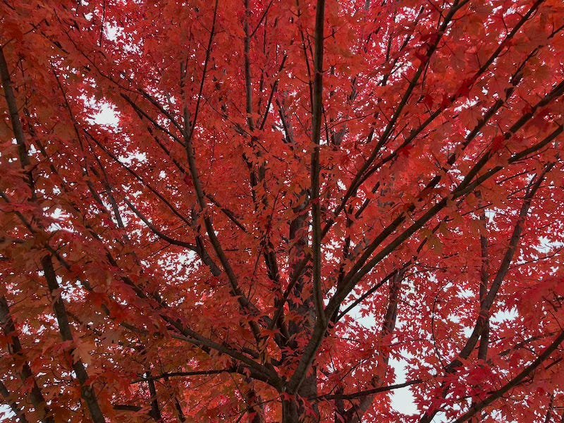 Some trees, specifically maples and oaks, produce anthocyanin pigments. These pigments create blue, purple, and red in the leaves. As consumers, we are familiar with anthocyanins when we “eat the rainbow”, enjoying the antioxidant properties of berries, grapes, cherries, plums, pomegranates, red cabbage, eggplant, black beans, and of course, wine!
