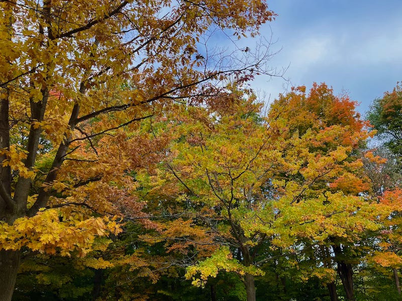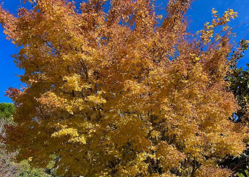 Species of trees that showcase a colorful changing of the guard in fall include Japanese Maple, Sugar Maple, Ginkgo Biloba, Red Oak, Liquidambar, Aspen, Crapemyrtle, Dogwood, Black Tupelo, Chinese Pistache, Sumac, Honeylocust, Hickory, and Beech. Several of these species grow in my garden, and by Thanksgiving they will have changed into their wondrous wardrobes before the branches shed their leaves for winter.