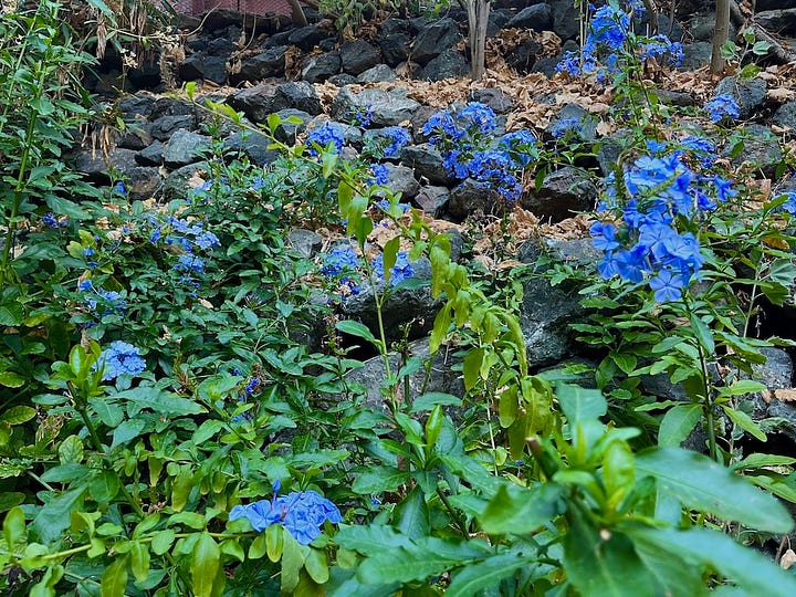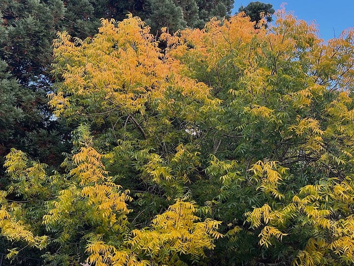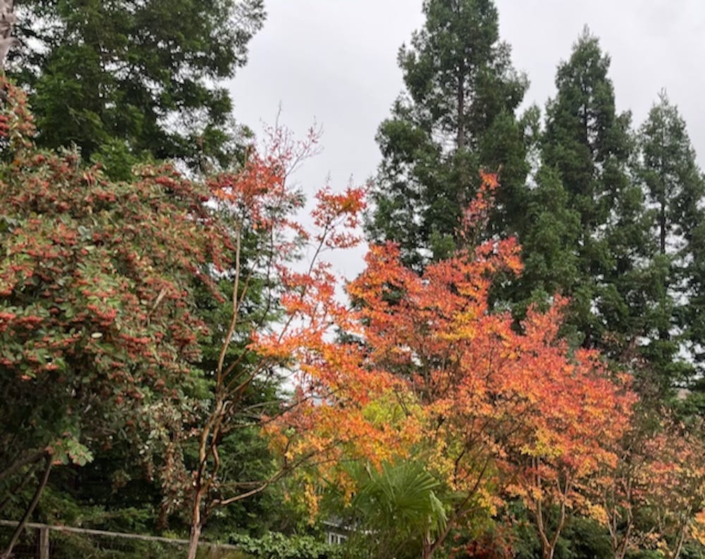 How grateful I am to witness this spectacular seasonal wardrobe change. Two of the most fascinating trees to me are my Chinese pistache. The male tree is tall, robust, sturdy, and golden. The female pistache is petite, graceful, and filled with clusters of crimson fruit that provide tasty treats for the birds and squirrels. If any berries remain in December, their colors will morph to aqua and pink, and I will pluck them to tuck into the branches of a holiday tree. I have allowed some seeds from my Chinese pistache tree to sprout in specified areas where I prune the plants to keep them small. As the weather cools, these volunteers resemble colorful blossoms.