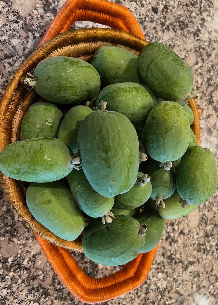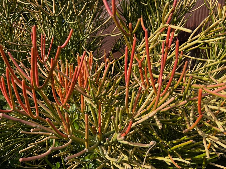 The tips of pencil cactus have turned a brilliant orange, matching the pumpkins I’ve seen decorating porches. My gigantic green guavas self-harvested. I gathered them and will let them ripen on the counter before either eating them raw or making jam or juice.