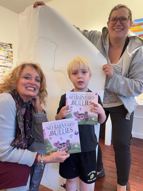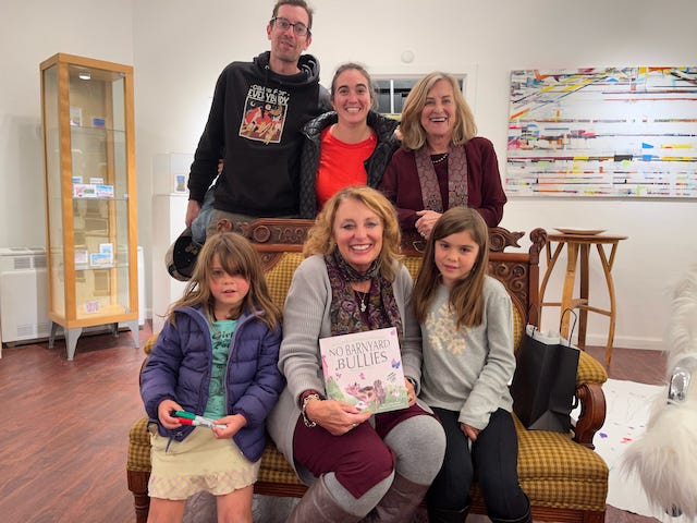 Throughout the afternoon families arrived at the gallery where I read No Barnyard Bullies to an enraptured audience of kids, followed by showing them videos and photos of the real characters from the book. The children shared their stories about their animals, school, friends, and bullies. Adults were treated to wine and champagne!