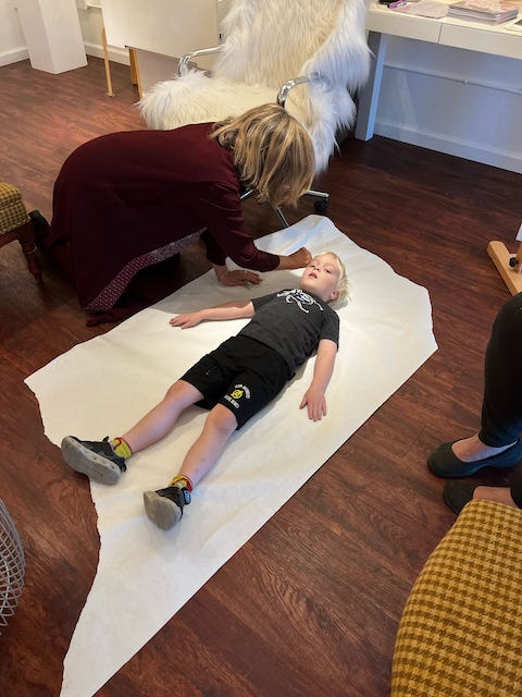 Margi’s art project included the children getting their body outlined on paper so that they could color it. Listening to the children discuss how they are kind and caring was deliciously sweet and very informative.