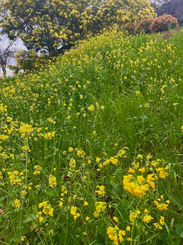 I am tickled with the signs of spring. Birdsong enchants me throughout the day, magical music energizing creativity. While the buzz of the honeybees fills the morning air, the croaking of the frogs reverberates throughout the evening. The pollinators are busy savoring the sweetness of the flowering peach tree, crabapple, and the viburnum in full bloom. March 20th marks the vernal equinox, yet we have been enjoying an early spring since the beginning of February. Yellow is the predominant color in March with wild mustard, Acacia trees, oxalis, Mexican stonecrop, and daffodils dotting roadways, gardens, and hillsides.