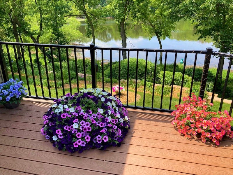 ADD brilliance to your patio or patio with containers filled with petunias, geraniums, or other summer bloomers.