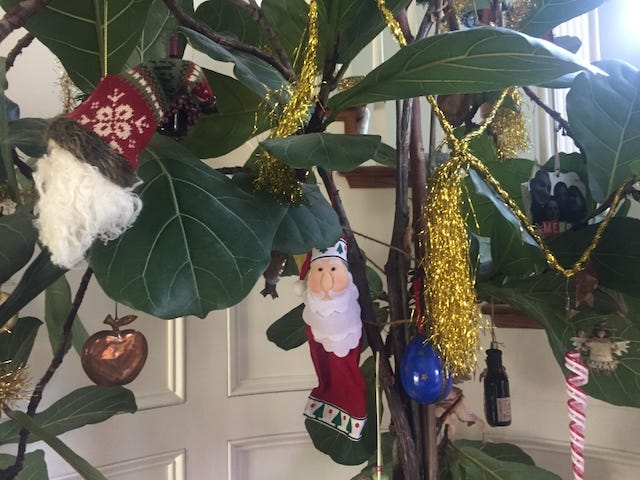Many people seek a Christmas tree or Hannukah bush to brighten their homes in December. Every tree is a perfect tree, even those Charlie Brown ones, especially if a child chooses. If possible, buy a living tree that can be placed on your patio after the holidays are over this year and be reused for the next festivity. Or any tree can be decorated. I always light up my fiddle leaf fig tree and fill it with ornaments and garlands. Fig trees are terrific for keeping indoor air fresher.