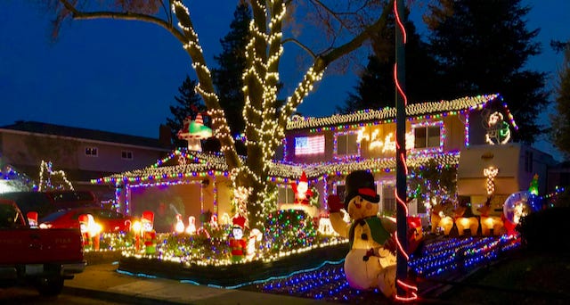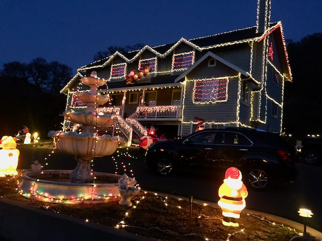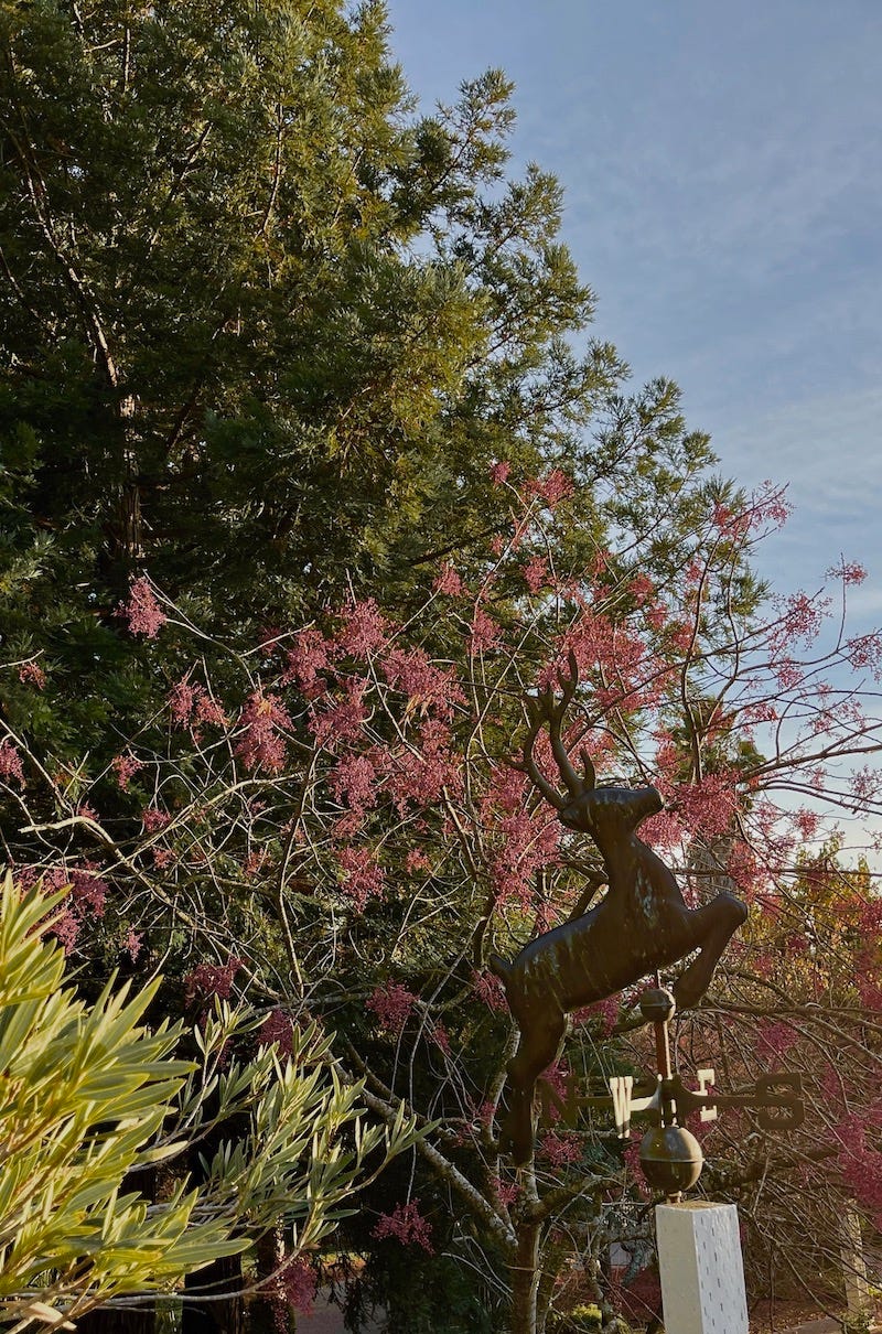 I climbed the hillside steps to marvel at the multitude of cherry-pink pistache berries flanked by the redwood tree that the squirrels had not devoured this year. In the foreground, my weathervane of a prancing deer reminded me of Dancer flying through the night sky.