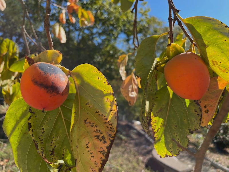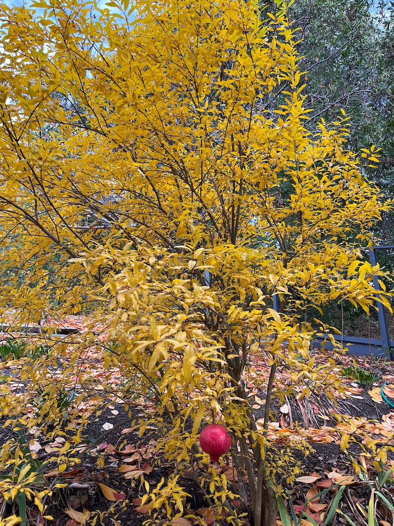 Hachiya persimmons resembled bright orange ornaments hanging on the near-bare branches. I mistook a lone red pomegranate hanging from the golden-leafed tree for a crimson Christmas bulb.