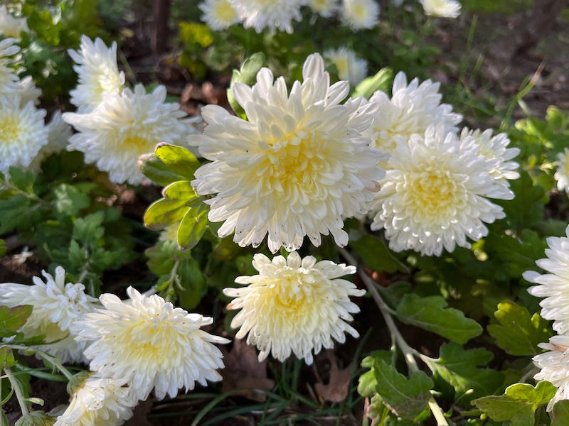 What I realized was that Mother Nature had already decorated my landscape for the holidays with colorful leaves carpeting the flower beds and blooming white chrysanthemums imitating snow.