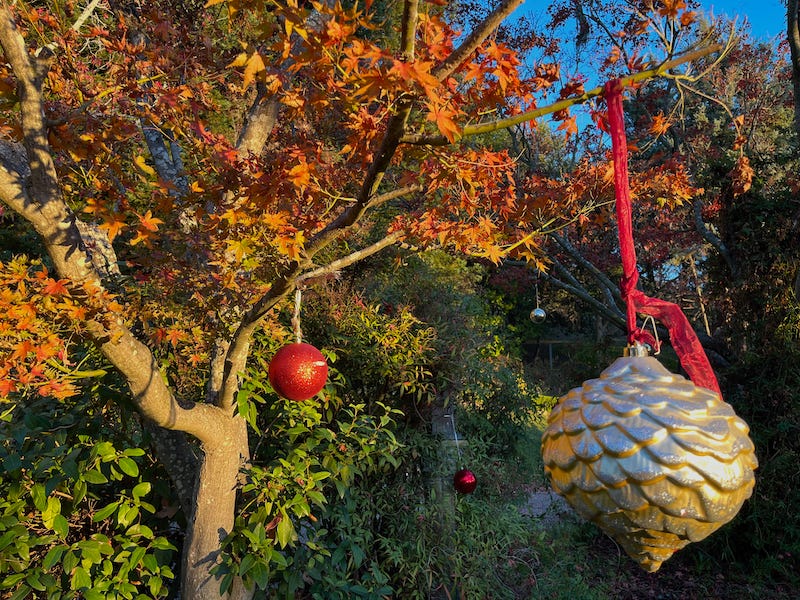I hung gold and red giant ornaments on my Japanese Maples. They glistened in the afternoon glare, yet these trinkets made by humans could not compare to what Mother Nature had already designed.