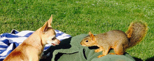 When he grew up, he met a female squirrel and raced off with her to start his own biological family. He didn’t forget his adopted family, however, and visited often with his progeny! Dolce Perra, the chihuahua was his best buddy and playmate.